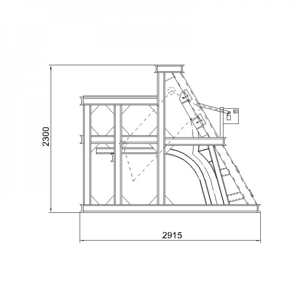 Участок головной (угол 65) 29 Е5-01.00.000-01 представляет собой металлоконструкцию, установленную на раме опорной 8. На головном участке смонтированы направляющие 7, обеспечивающие в паре с контршиной 6 движение ковша в заданном направлении. Стабилизация ковша при опрокидывании осуществляется при помощи упоров 1 и шин 3, удерживающих ковш от боковых колебаний. На головном участке имеется площадка для установки лебедки. Габаритные размеры площадки позволяют смещать лебедку относительно центра подъемника в зависимости от длины скреперования.